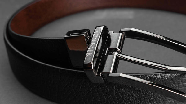 The buckle, available in polished silver, brushed graphite, or dark nickel, is slim and understated, featuring a subtle Von Baer logo. Packaged in an elegant gift box, the Premier belt is the ideal accessory for any occasion.